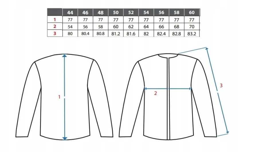 Wykończenie: estetyczna stójka chroniąca szyję, dwurzędowe guziki ułatwiające zapinanie, obszyty kołnierz i długi rękaw