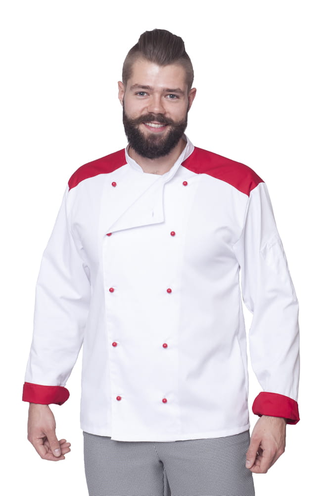 Inspirowana światowymi trendami, nowoczesna bluza kucharska dla wymagających. Asymetryczne zapięcie i wyraziste kolory dodatków sprawiają, że wyróżnisz się w każdej kuchni.