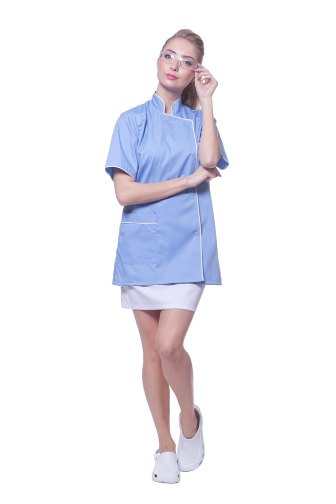 Wyróżnij się nowoczesnym stylem dzięki fartuchowi medycznemu Ala. Ten model o kroju żakietu z asymetrycznym zapięciem łączy w sobie klasyczną elegancję z modnym designem, stanowiąc idealny wybór dla personelu medycznego i kosmetycznego.