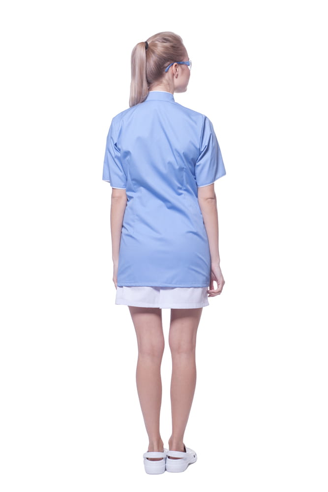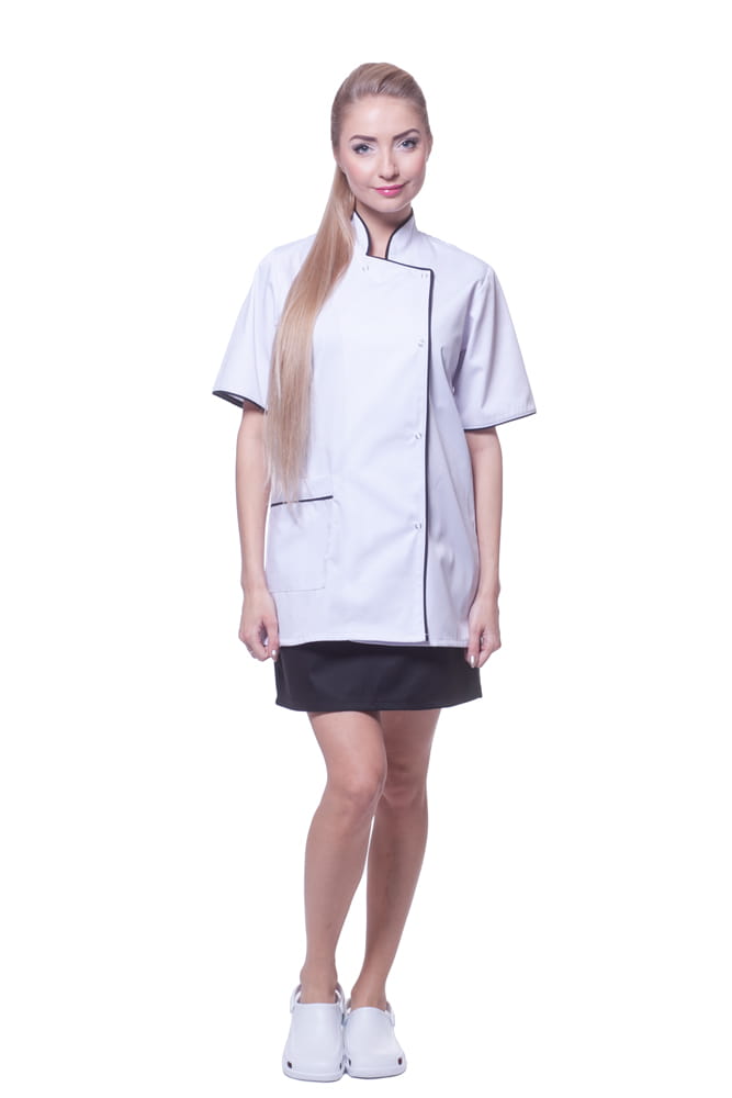 Fartuch został uszyty z wysokiej jakości elanobawełny, co zapewnia trwałość kolorów oraz łatwość w pielęgnacji. Taliowany fason ze stójką doskonale dopasowuje się do sylwetki, a krótki rękaw zapewnia komfort pracy nawet w cieplejsze dni.