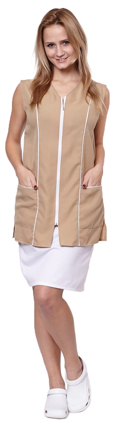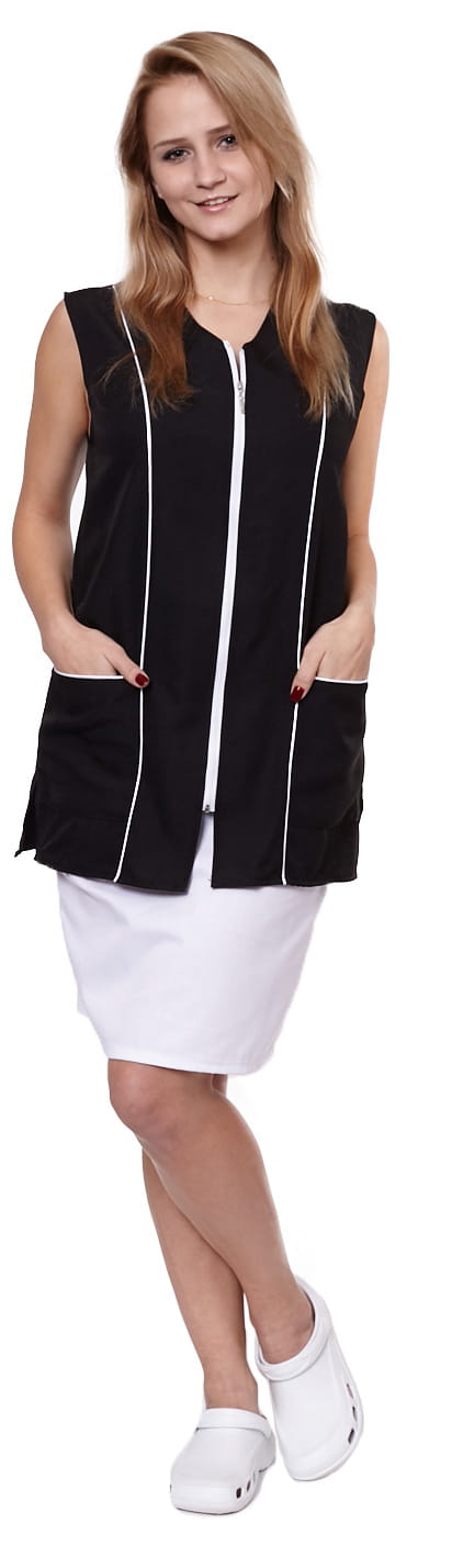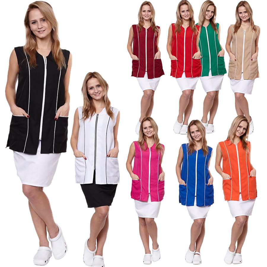 Zadbaj o nienaganny wygląd w pracy dzięki fartuchowi damskiemu DORIS. Ten elegancki model, zapinany na zamek, to idealna propozycja dla pań pracujących w sklepach, gabinetach, salonach fryzjerskich czy gastronomii. Ozdobna lamówka przy dekolcie i kieszeniach nadaje mu stylowego charakteru, a praktyczny krój zapewnia komfort noszenia.