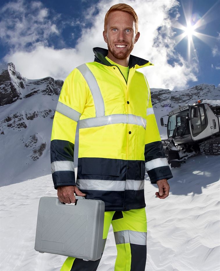 Długa kurtka typu parka o wysokiej widoczności. Zapewnia doskonałą ochronę przed mrozem, wiatrem i opadami, gwarantując jednocześnie bezpieczeństwo dzięki pasom odblaskowym.