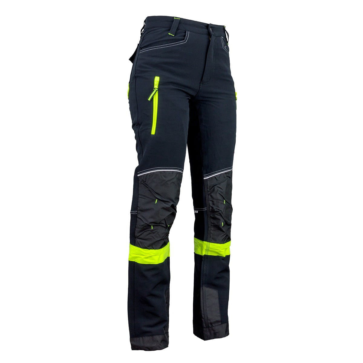 Elastyczna tkanina podąża za każdym Twoim ruchem, a nowoczesny krój sprawia, że wyglądasz w nich profesjonalnie. Spodnie wyposażono w elementy odblaskowe, które znacząco poprawiają Twoją widoczność po zmroku, zwiększając bezpieczeństwo na placu budowy czy przy drodze. Liczne kieszenie na zamki i rzepy pozwalają bezpiecznie przechować telefon i klucze.